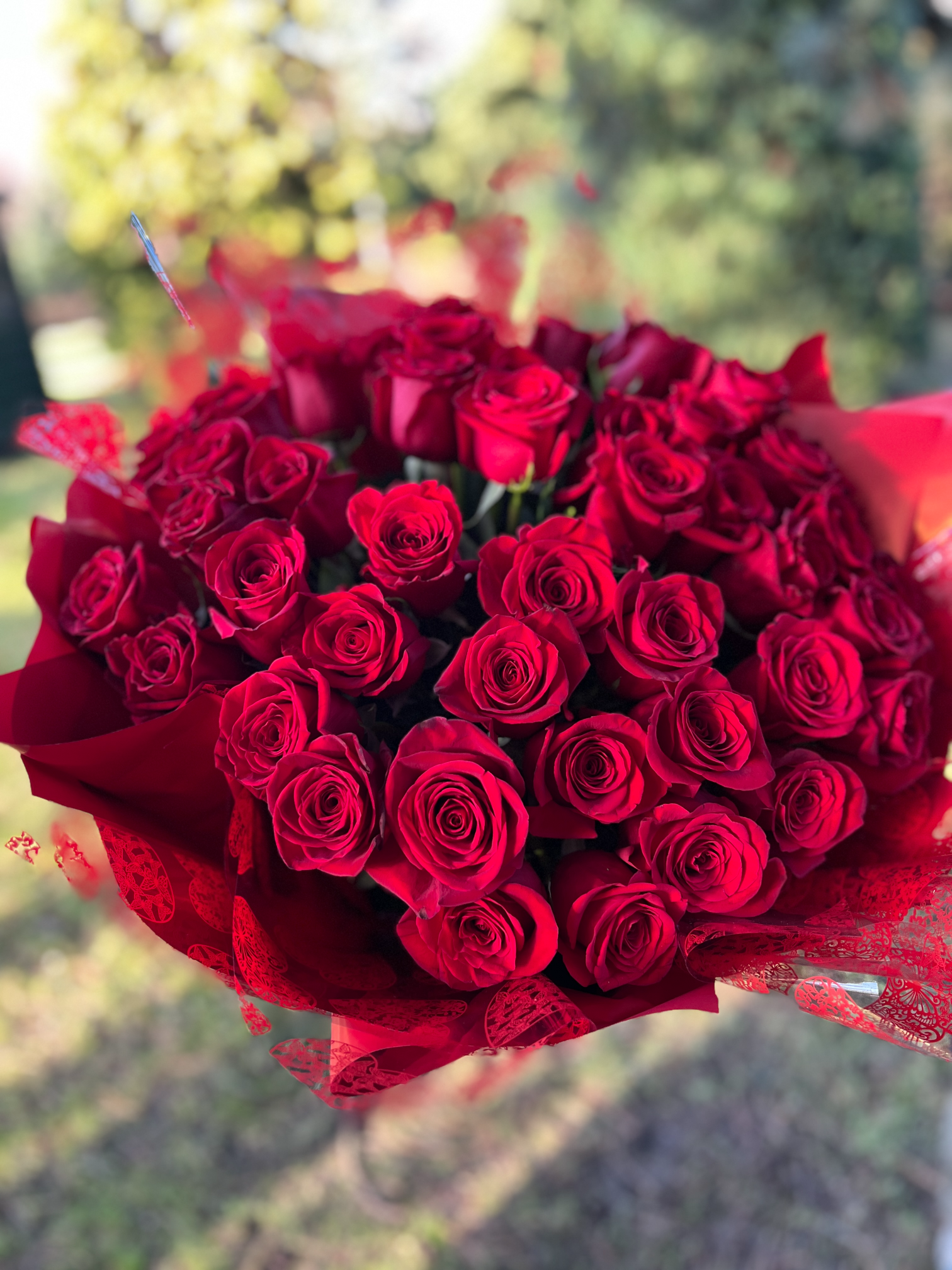 Okazały bukiet czerwonych róż w czerwonej oprawie. Spektakularny symbol miłości i namiętności.