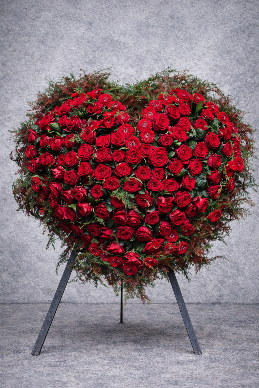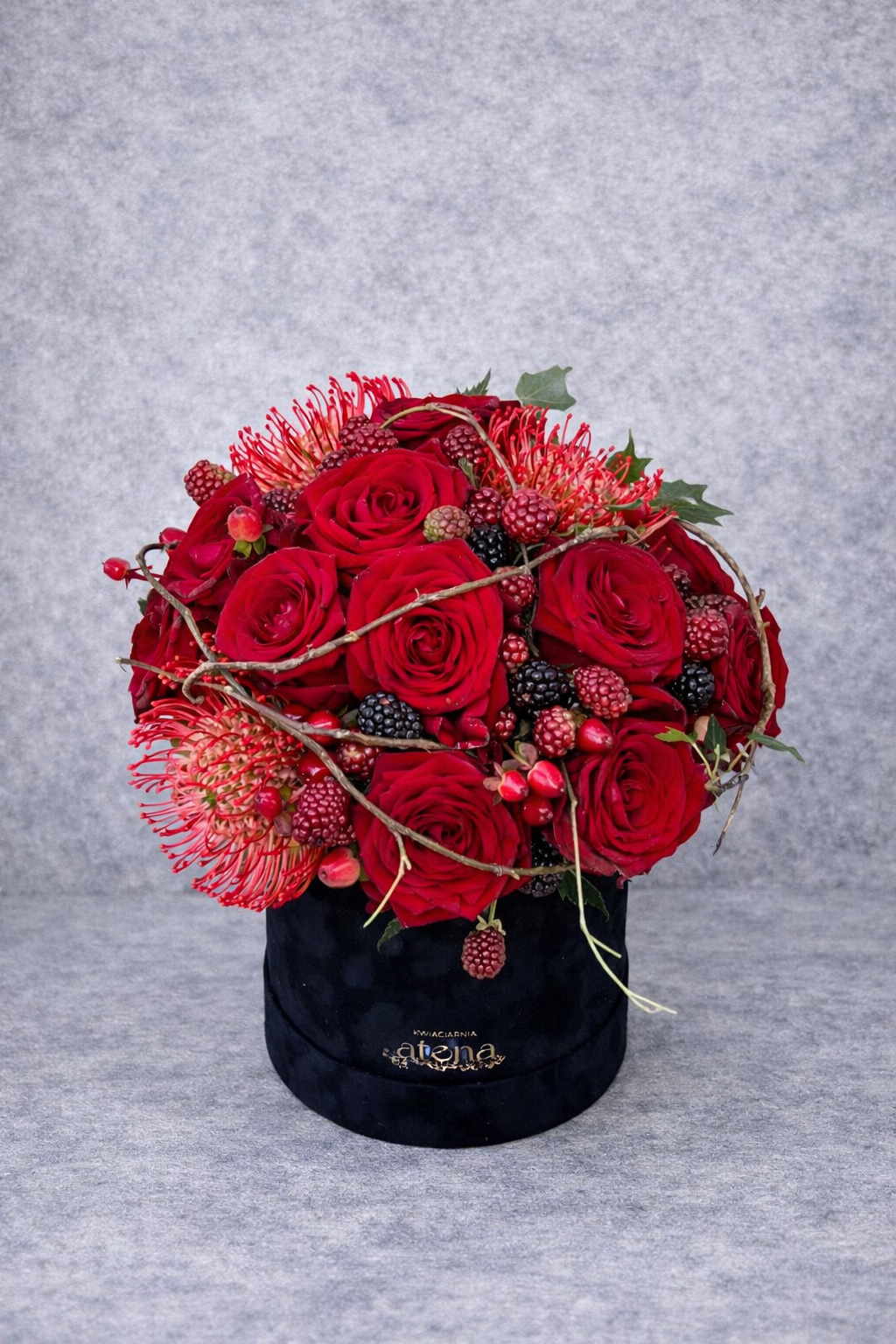 Czerwone róże z dodatkami w welurowym pudełku. Subtelne połączenie klasyki i nowoczesności.